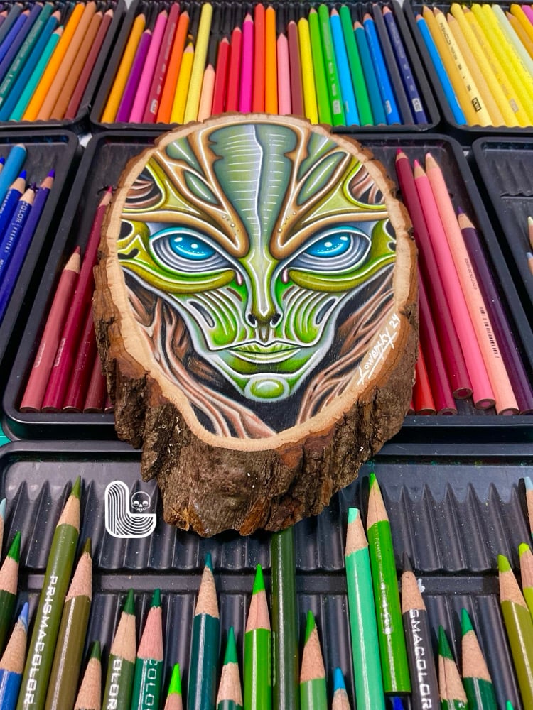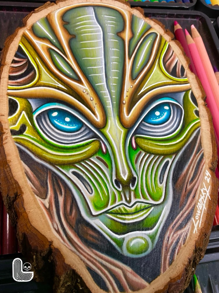 “Earthly Alien” brings an extraterrestrial being to life with a twist, using colors inspired by the earth itself. The alien’s face, blending natural tones of browns, greens, and ochres, gives it a grounded yet otherworldly presence. Its piercing ocean-blue eyes gaze directly at the viewer, creating an intense, almost hypnotic connection that pulls you into its world.