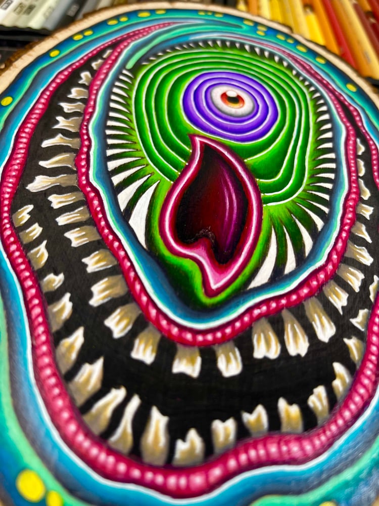Eerie Chuckle is a vibrant piece created with colored pencils on basswood, bringing out rich textures and bold, psychedelic hues. This one-of-a-kind artwork blends eerie energy with cosmic whimsy, making it a striking addition to any collection. Don’t miss the chance to own this unique creation!