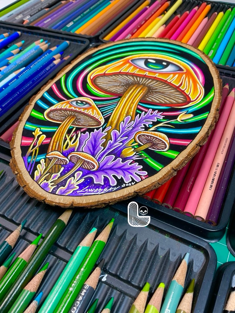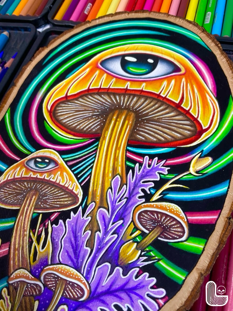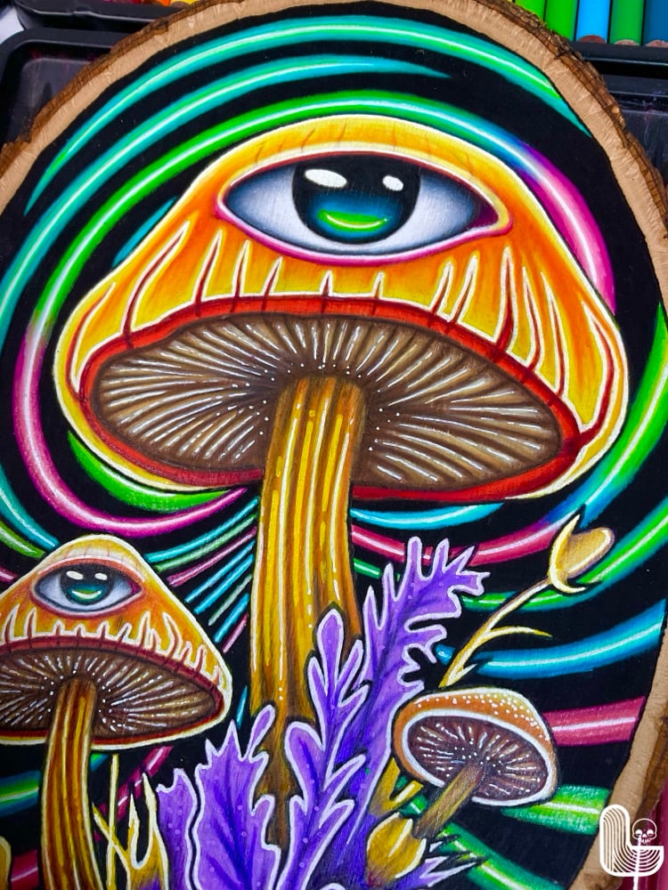 Step into a world of vibrant psychedelia with “Mushroom Trip”, where the boundaries of reality dissolve into a kaleidoscope of color and mind-bending visuals. This piece transports the viewer on a journey through a dimension of otherworldly fungi. The intense, surreal colors swirl and pulse, creating the sensation of being swept into a psychedelic trance that is both captivating and bizarre.