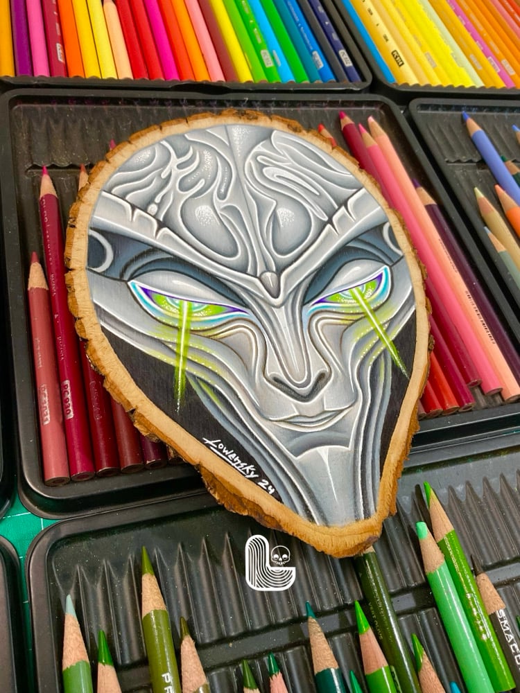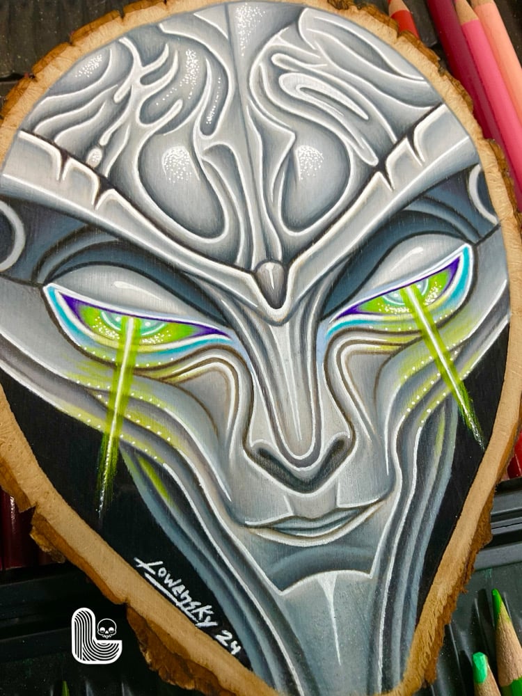This alien’s gaze is piercing, with neon green beams of light radiating from its eyes, suggesting a connection to another world. The vivid contrast of the colors against the smooth basswood surface creates a striking, otherworldly aura, inviting the viewer to explore the depths of its presence.